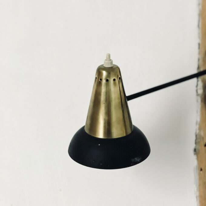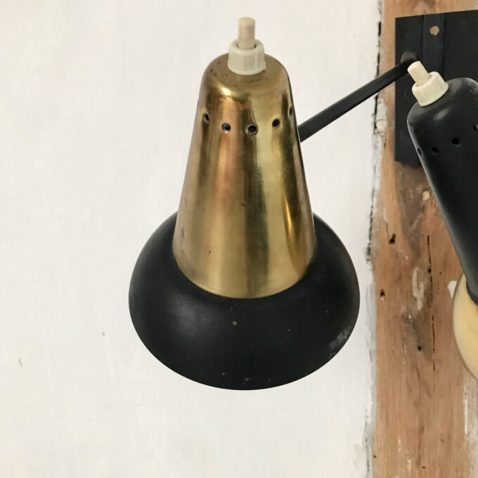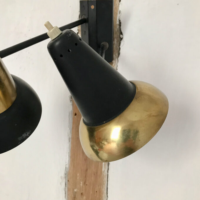 L’applique murale design est une lampe double en métal noir et doré. Vous pourrez allumer individuellement chaque abat-jour avec leur bouton poussoir.
