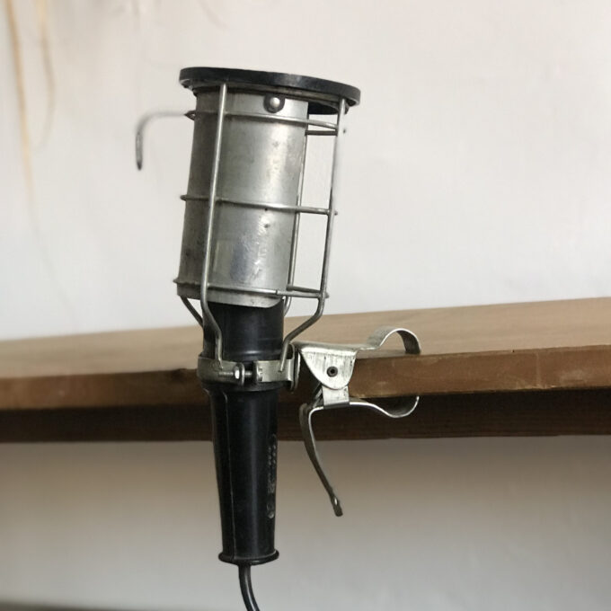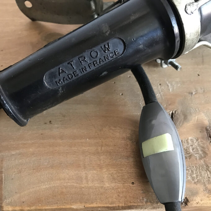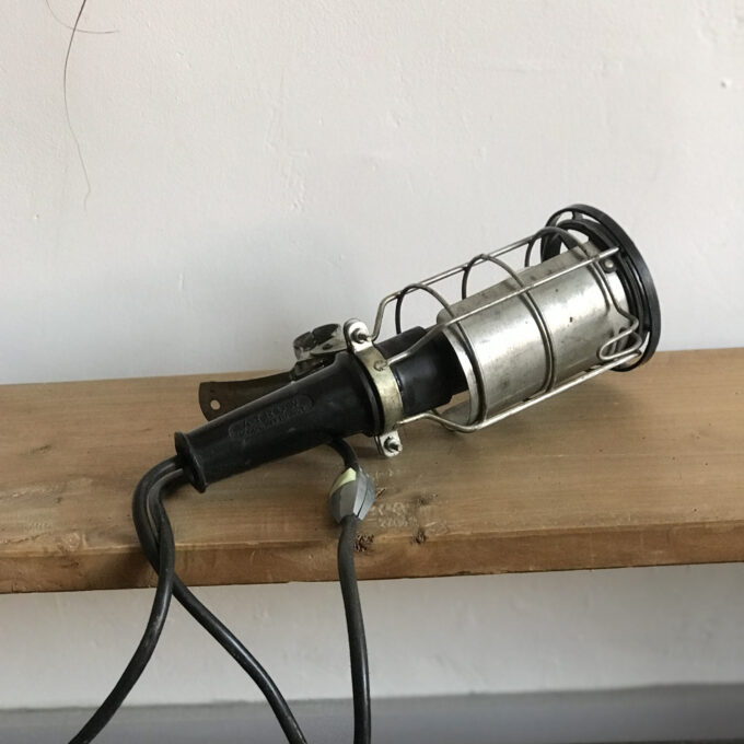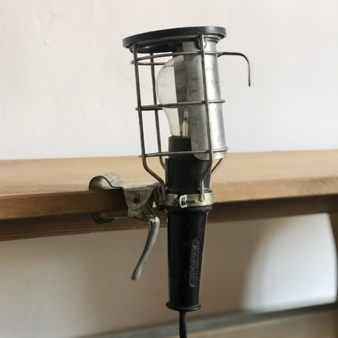 Baladeuse d'atelier ancienne Atrow made in France avec accroche et pince d'attache Bon état avec traces d'usure largeur 17cm profondeur 11cm hauteur 26cm longueur fil électrique 383cm ampoule à baïonnette (non fournie)