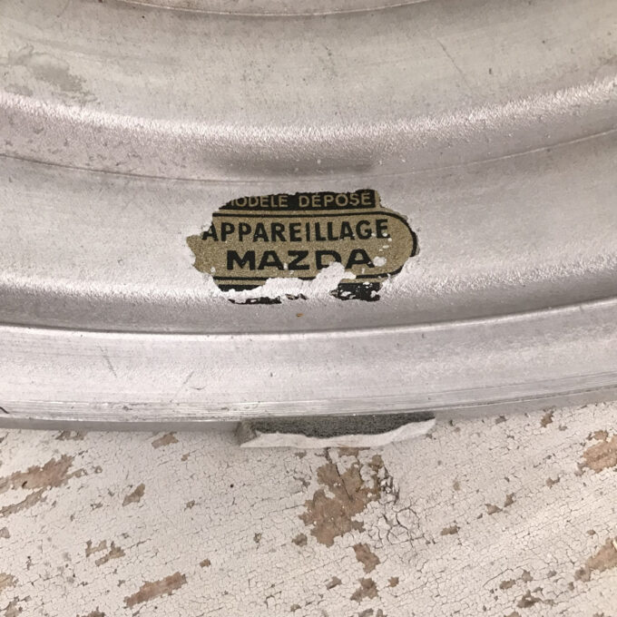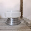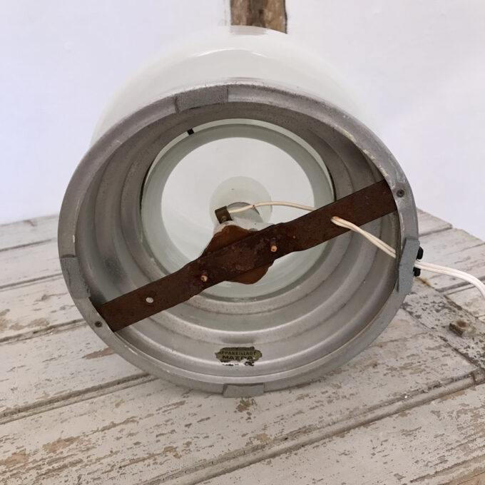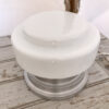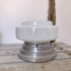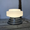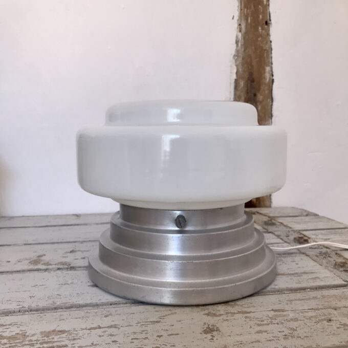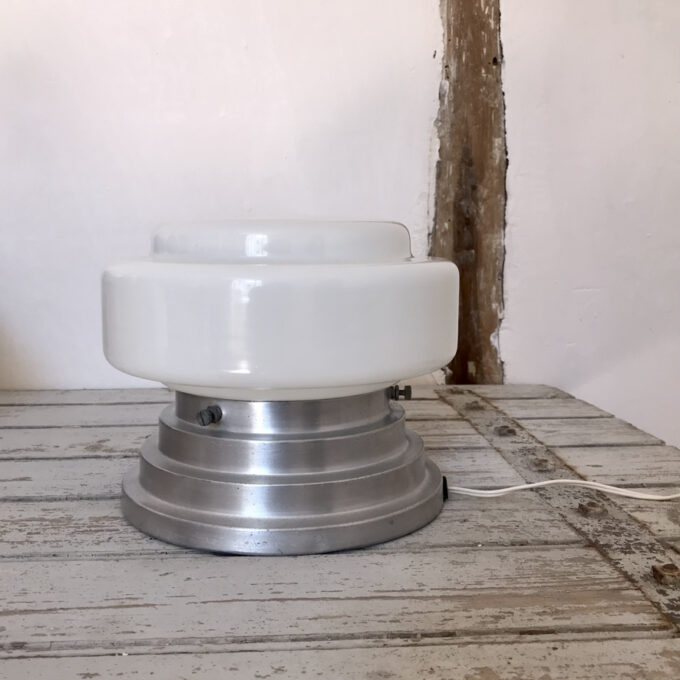 Lampe de table à poser Madza. Opaline blanche et base en aluminium chromé. Forme champignon Bon état sauf quelques traces d'usure sur le pied Electricité d'origine largeur abat- jour 22cm largeur pied 20.5cm profondeur 22cm hauteur abat-jour 11cm hauteur pied 8cm hauteur totale 19cm Autre lampe à poser à retrouver sur le site : Lampe de bureau métal et opaline