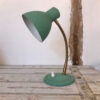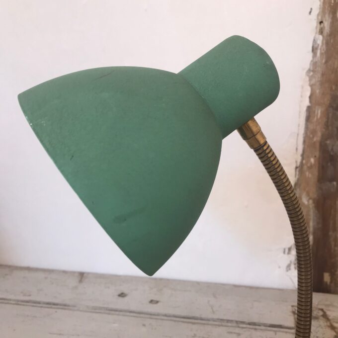 Petite lampe de bureau ou de chevet à col de cygne des années 1950-60. En métal, peint en vert et bras flexible en laiton.