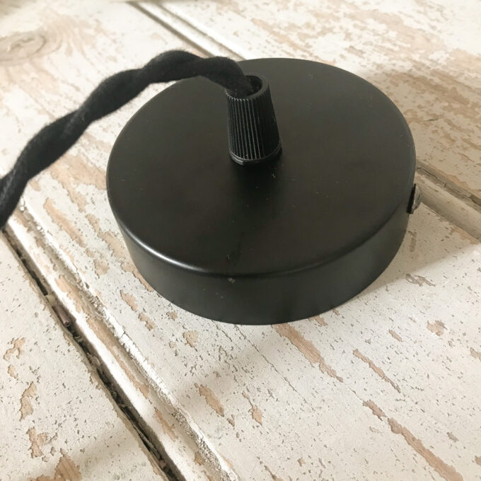 Détails électriques : câble torsadé noir, rosace plafond en porcelaine noire, douille en métal doré, serre-câbles et dessus en laiton Ampoule à vis E27 (non fournie)