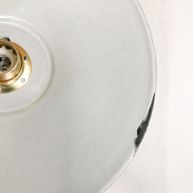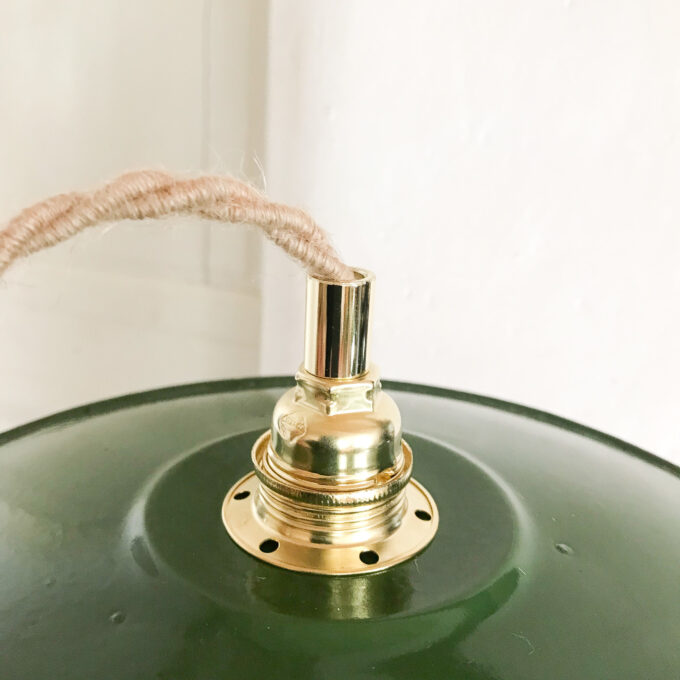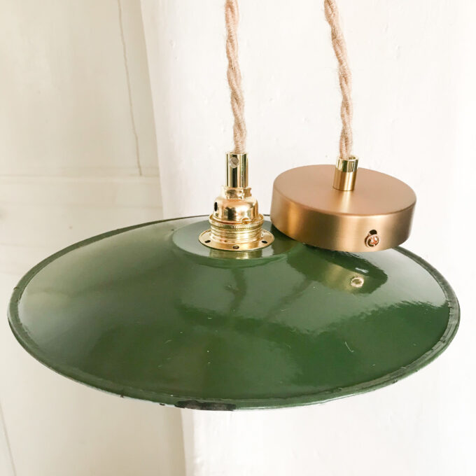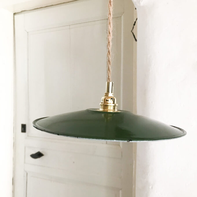 Cette lampe en métal industriel a été réalisée avec un ancien abat-jour en métal vert chiné.