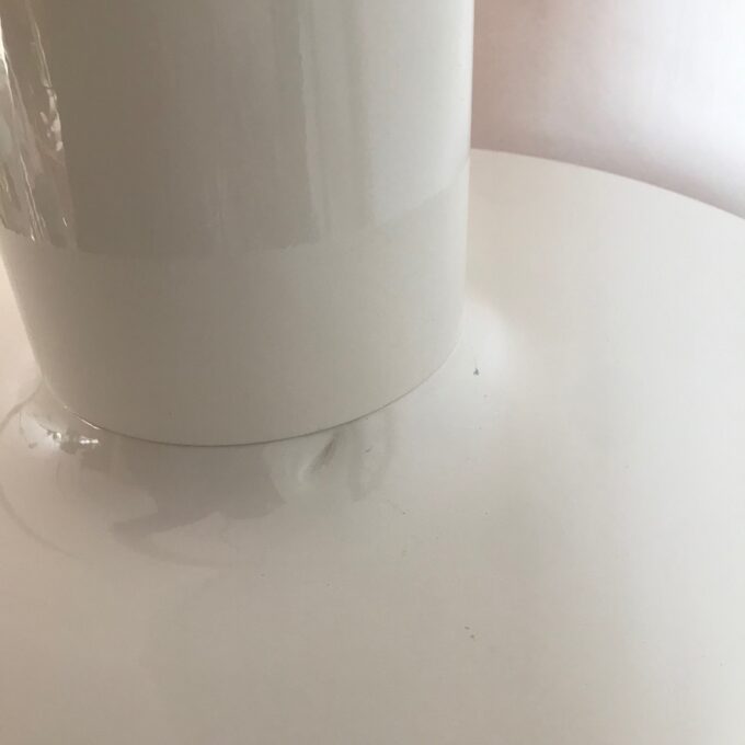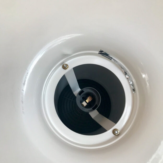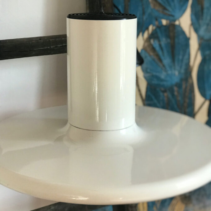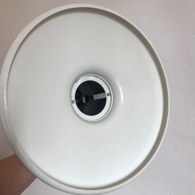 Détails électriques : Electrification d’origine, parfaitement fonctionnelle avec douille noire ampoule E27 (non fournie) et câble et rosace en plastique noir.