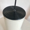 Suspension luminaire design en métal laquée blanc et plastique noir avec un design tout en courbe.